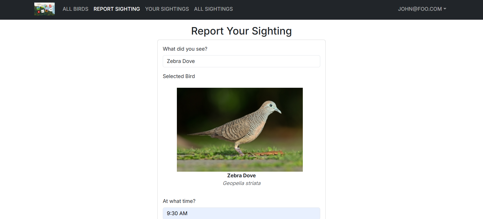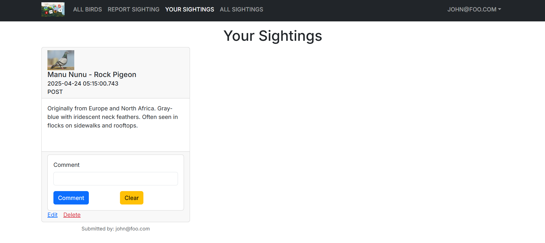And finally a page that lists each individual user’s own sightings.